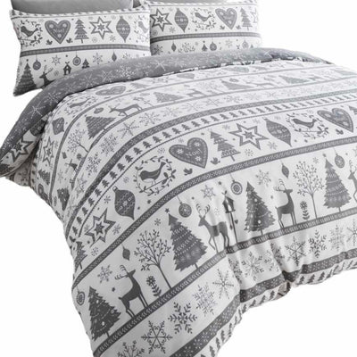 - This grey duvet set features a Christmas pattern with baubles, reindeer, Christmas trees and snowflakes