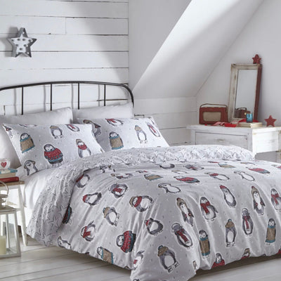 - Our Snowy Penguins Duvet Set is available in single, double and king size and in red or grey